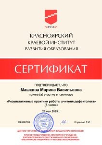 2021г., март Красноярский государственный педагогический университет им. В. П. Астафьева XXIII Международной научно-практической конференции имени профессора В.А. Ковалевского «Психология и педагогика детства: развитие,воспитание, образование детей в условиях пандемии и ограниченного взаимодействия»