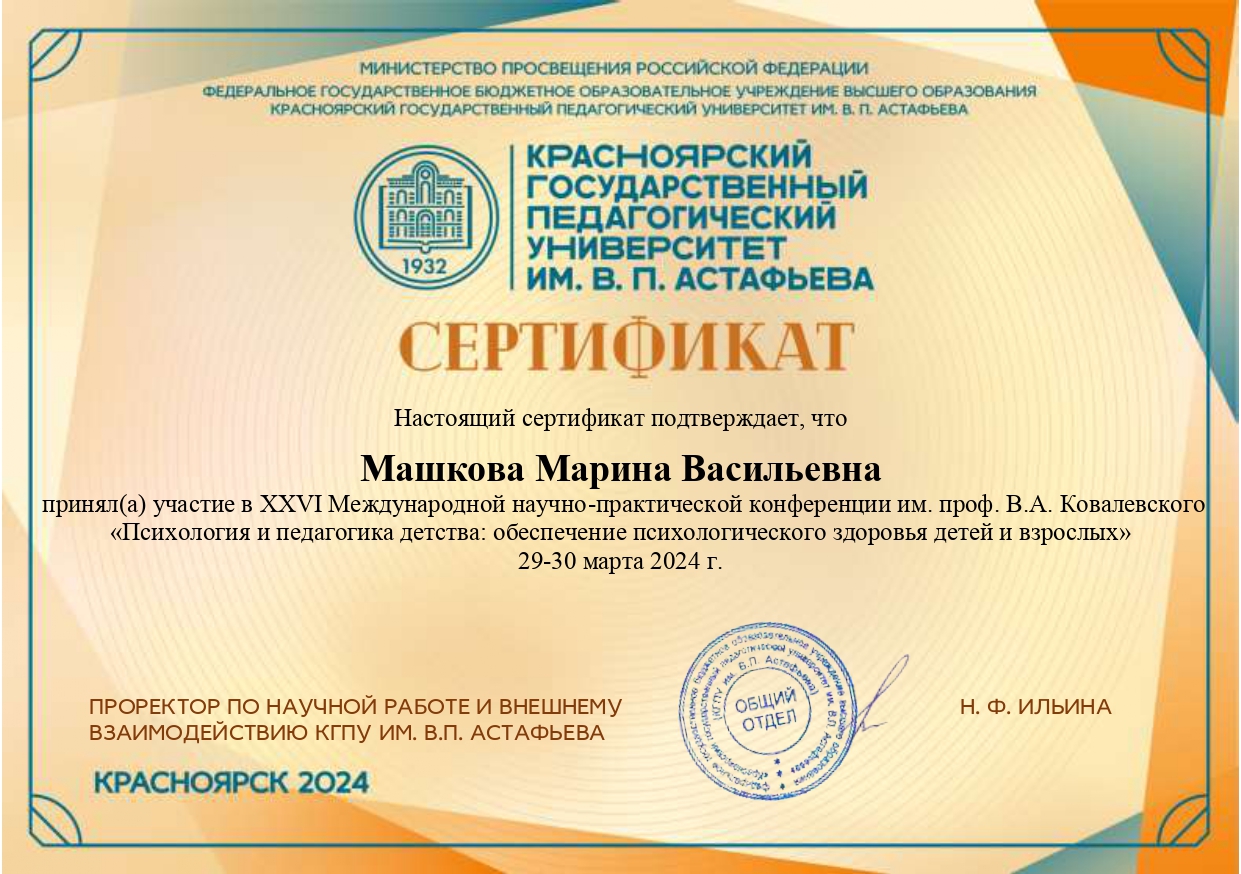 2022 г. март Красноярский государственный педагогический университет им. В. П. Астафьева XXIV Международной научно-практической конференции имени профессора В.А. Ковалевского «Психология и педагогика детства: о воспитании, воспитанности, воспитателях»