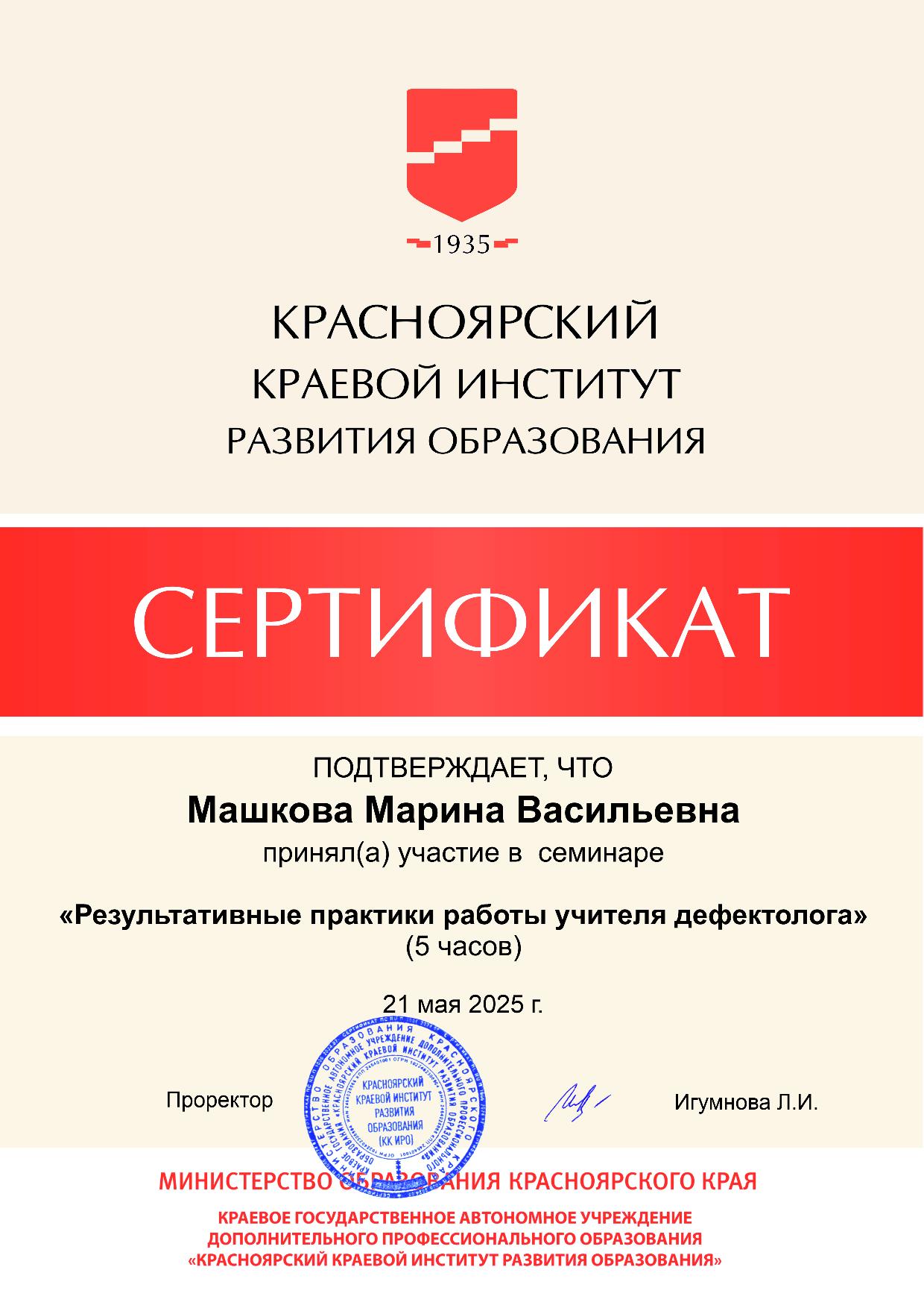 2018 г. Международный институт аутизма КГПУ им. В. П. Астафьева Тема: «Разработка и внедрение эффективной наукоемкой высокотехнологичной методики коррекции когнитивных нарушений у детей-инвалидов», 36 ч